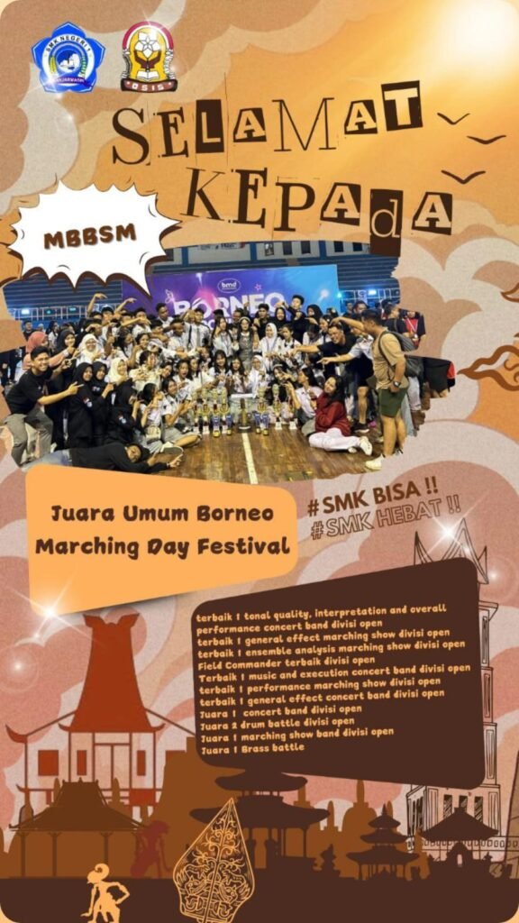 Banjarmasin, Mei 2025 β SMK Negeri 1 Banjarmasin kembali menorehkan prestasi membanggakan di kancah regional melalui unit Marching Band andalan sekolah, Bahana Saka Multitalent. Dalam gelaran Borneo Marching Day Festival 2025 yang berlangsung pada 26β27 Mei 2025, tim Bahana Saka Multitalent berhasil menjadi Juara Umum, mengungguli berbagai tim dari sekolah-sekolah terbaik di Kalimantan dan sekitarnya.