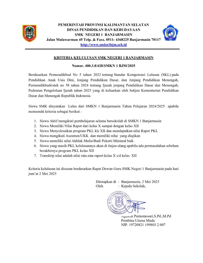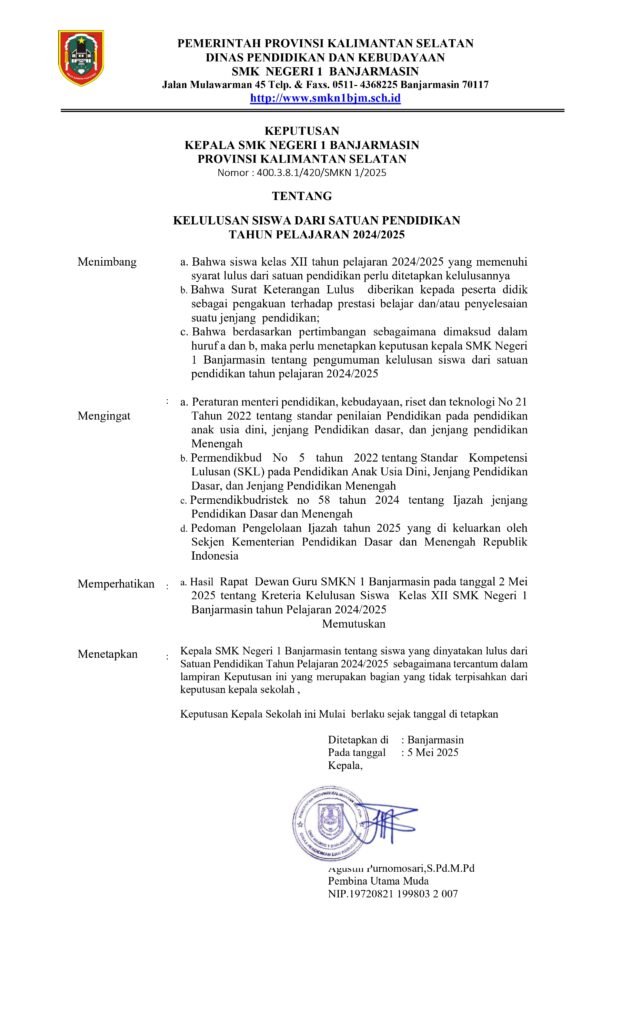 Puji syukur kita panjatkan ke hadirat Allah SWT, Tuhan Yang Maha Esa atas limpahan rahmat dan karunia-Nya, sehingga pada hari ini : Senin, 05 Mei 2025, SMKN 1 Banjaramasin dapat menyampaikan pengumuman kelulusan bagi peserta didik kelas XII tahun ajaran 2024/2025.
